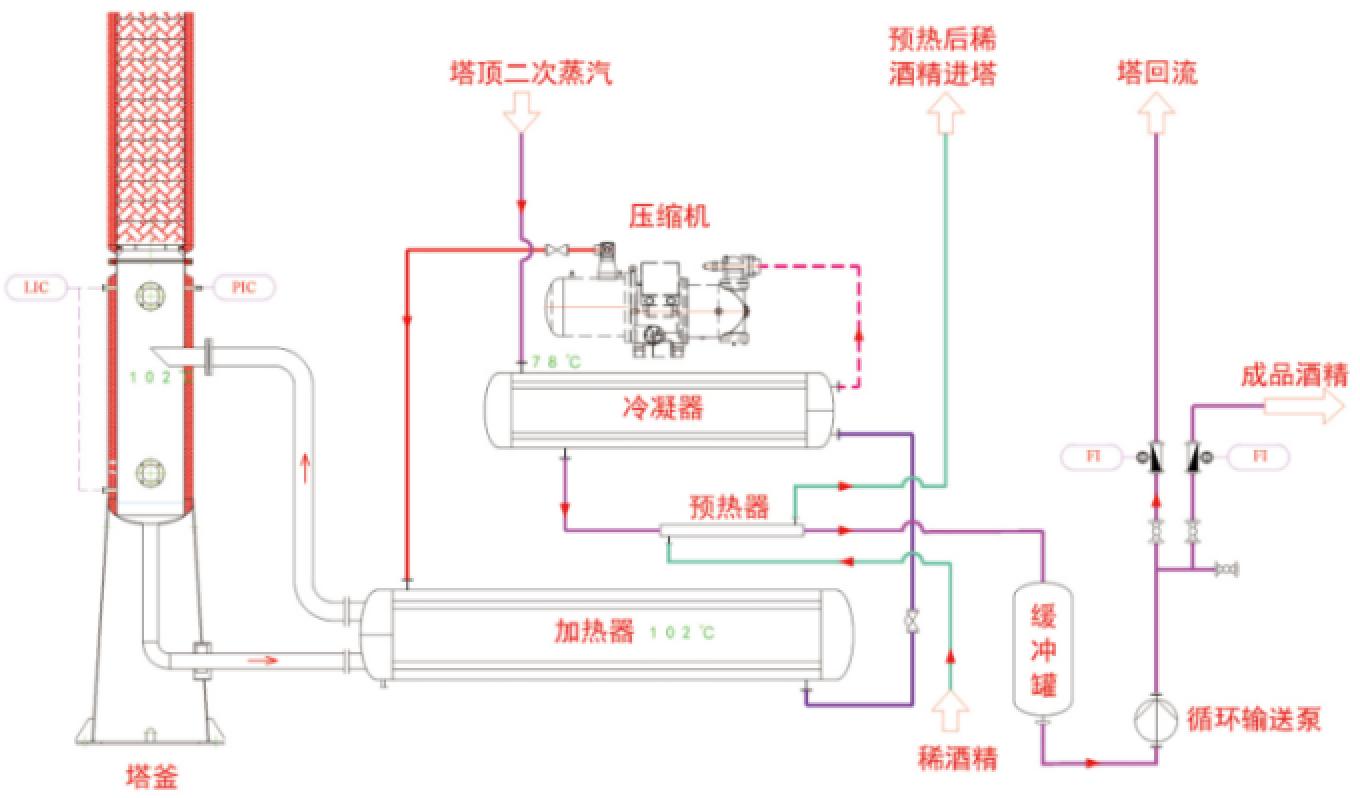 传统精馏设备与制冷行业的热泵技术相结合,利用热泵的热侧去加热低浓度酒精使其蒸发、热泵的冷侧去冷凝冷却蒸发产生的二次蒸汽,热泵系统中的冷热双向利用完全替代了传统热源锅炉蒸汽与冷源冷却循环水,从而达到节能降耗的目的。